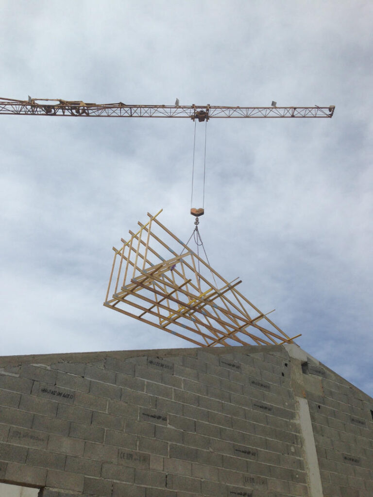 Chantier EHPAD de Condom, réalisation de la charpente puis pose de la couverture tuiles avec bardage en bois pose à claire voie.